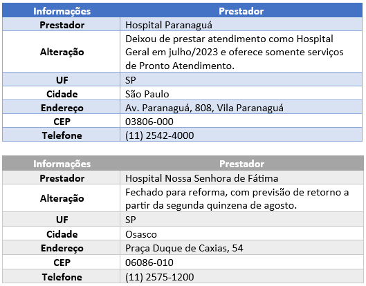 Informamos nossos beneficiários que foram realizadas duas alterações no atendimento de hospitais da nossa rede credenciada, localizados em São Paulo e Osasco. O Hospital Paranaguá deixou de prestar atendimento como Hospital Geral, oferecendo apenas serviços de Pronto Atendimento, e o Hospital Nossa Senhora de Fátima está fechado temporariamente para reformas.