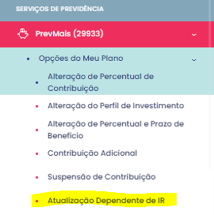 Acesse o autoatendimento do Economus clicando aqui. Clique em Cadastro > Selecione seu plano de benefícios e clique em Atualização de Dependentes de IR: