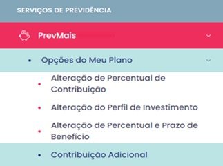 Como contribuir: Basta acessar o autoatendimento e escolher a opção “Previdência”. No menu à esquerda, clique em PrevMais e, em seguida, “Opções do Meu Plano”. Escolha “Contribuição Adicional”: