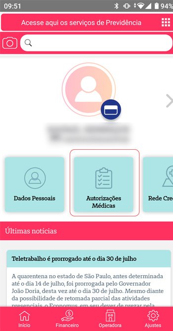 Ainda, você poderá acompanhar a liberação do procedimento pelo App Economus, no botão “Autorizações Médicas”, na página inicial: