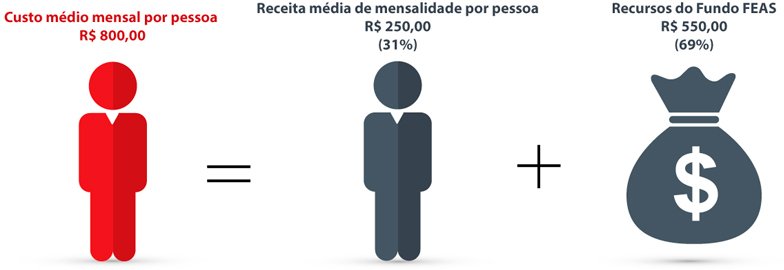 No Economus, conforme publicado no Boletim de Resultado Assistencial, até outubro de 2018, a média do custo total por pessoa nos planos FEAS foi de aproximadamente R$ 800,00 por mês, enquanto que a receita média de mensalidade por pessoa foi cerca de R$ 250,00. Desta forma, o Fundo FEAS custeou em torno de R$ 550,00 por beneficiário ao mês, durante este período.