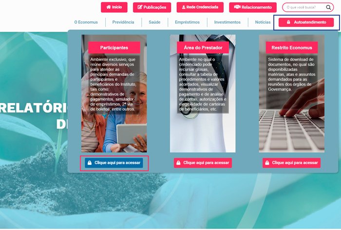 Acesse o Portal de Serviços (site) do Economus, clique na aba “Autoatendimento” e escolha a opção “Clique aqui para acessar” no campo de Participantes. Acesse com seu CPF e Senha cadastrados (caso seja seu primeiro acesso, clique em “Primeiro Acesso”).
