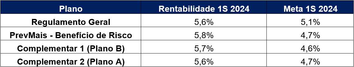 Abaixo, apresentamos a rentabilidade de cada plano em comparação com a meta traçada para o período: