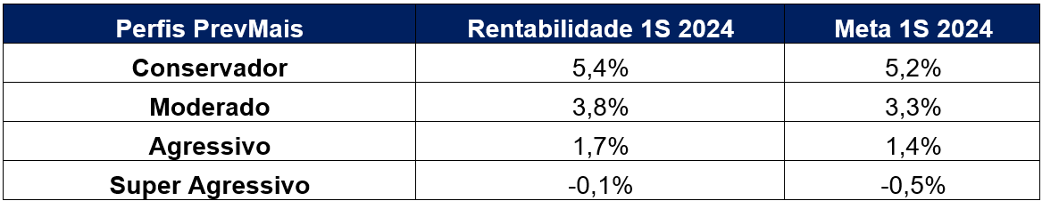 Os Perfis de Investimento do PrevMais também superaram as metas de rentabilidade. Destacamos o Perfil Conservador, que atingiu 105% do seu benchmark, o CDI, no semestre, conforme a tabela a seguir:
