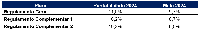 Em 2024, a gestão do Economus alcançou resultados importantes na rentabilidade dos planos. Mesmo em meio a um cenário econômico desafiador, a rentabilidade dos planos BD superou as respectivas metas, conforme tabela a seguir: