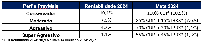 Já o PrevMais Benefício de Risco, que representa a parcela BD do Plano, alcançou rentabilidade 10,9%, superando sua meta para o ano de 2024, que era de 9,0%.