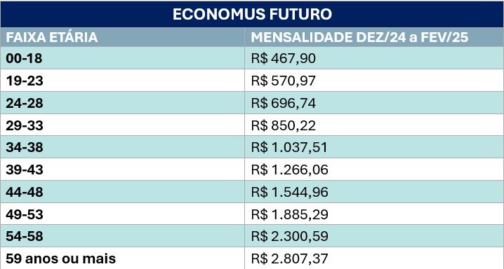 O Economus Futuro, pelo segundo trimestre consecutivo, não terá alteração nos valores da tabela de contribuições por faixa etária. O estudo técnico, que analisa o desempenho e é realizado trimestralmente para assegurar a sustentabilidade do plano, demonstrou situação de equilíbrio econômico-financeiro para suportar a decisão de manter o valor da cota para o período de dezembro/24 a fevereiro/25.