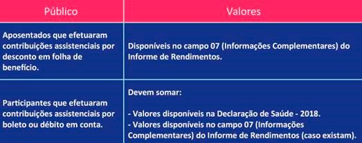 A Declaração de Contribuição Assistencial é gerada exclusivamente em nome do Titular do plano e estará disponível somente para os beneficiários que tiveram pagamento e/ou reembolso realizado em 2018, contemplando os valores de contribuição/mensalidade e coparticipações pagas através de boleto bancário e/ou débito em conta, além de reembolso efetivado através de crédito em conta, individualizando as parcelas relativas ao titular e a cada dependente.