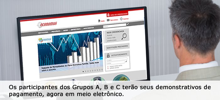 Atendendo a estes preceitos, informamos que a partir do mês de setembro/2016, os demonstrativos de pagamento dos beneficiários dos Grupos A, B e C serão disponibilizados somente na área restrita do site do Economus, portanto será descontinuado o processo de impressão mensal destes documentos e envio pelos Correios.