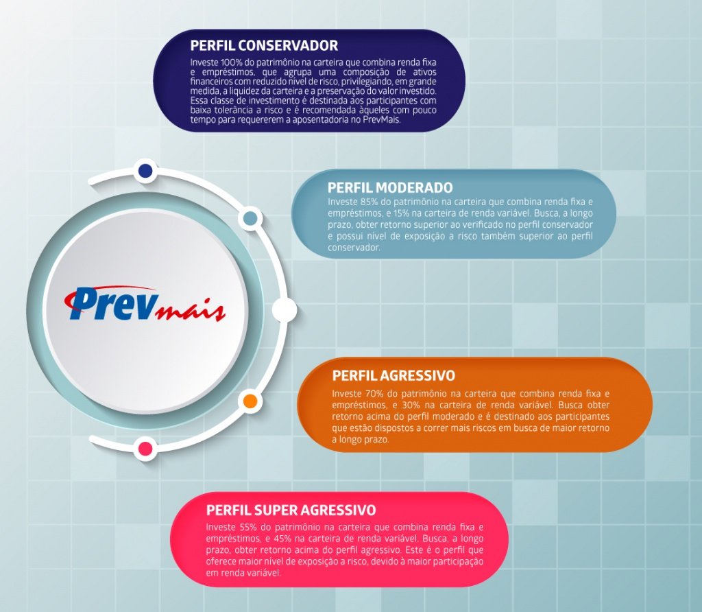 Entre os dias 01 e 15 de maio, os participantes do plano PrevMais poderão realizar alteração de seu perfil de investimento. Esta mudança pode ser efetuada em 3 períodos do ano, sempre durante as primeiras quinzenas dos meses de janeiro, maio e setembro.