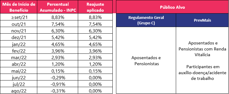 Para os planos Regulamento Geral (Grupo C) e PrevMais, como previsto nos regulamentos, o reajuste integral será de 8,83%. O número foi calculado com base no acumulado do INPC (Índice Nacional de Preços ao Consumidor), respeitando a proporcionalidade da data de início de benefício, conforme demonstrado a seguir: