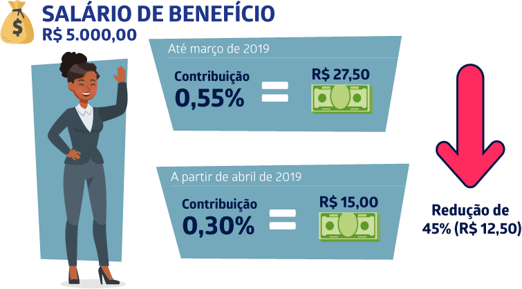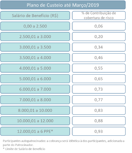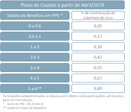 Diante desta performance positiva, fatores como o excesso na margem de segurança do plano e a redução do número de concessões de benefícios de risco, permitiram que durante a Avaliação Atuarial de 2018 fosse identificada a oportunidade de redução do percentual das contribuições para cobertura dos benefícios de risco, a partir de abril/2019, sendo preservada a segurança técnica do plano.