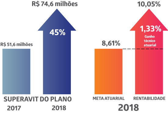 Apesar do cenário desafiador da economia brasileira, em 2018, o plano PrevMais apresentou excelente desempenho, fechando o ano com superavit de R$ 74,6 milhões, um crescimento de 45% em relação a 2017, e com uma rentabilidade de 10,05%, ficando acima da meta atuarial (8,61%) para o período.