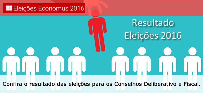 Em atendimento ao cronograma disposto no Anexo I do Regulamento do Processo Eleitoral do Economus, divulgamos nesta data, 15.04.2016, o resultado das Eleições 2016, apresentando os novos membros titulares e suplentes para compor os colegiados dos Conselhos Deliberativo e Fiscal, a partir de 01 de junho de 2016.