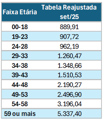 A mensalidade é cobrada antecipadamente na forma de pré-pagamento, sem coparticipação e com valor estabelecido de acordo com a faixa etária do usuário. Veja a tabela abaixo: